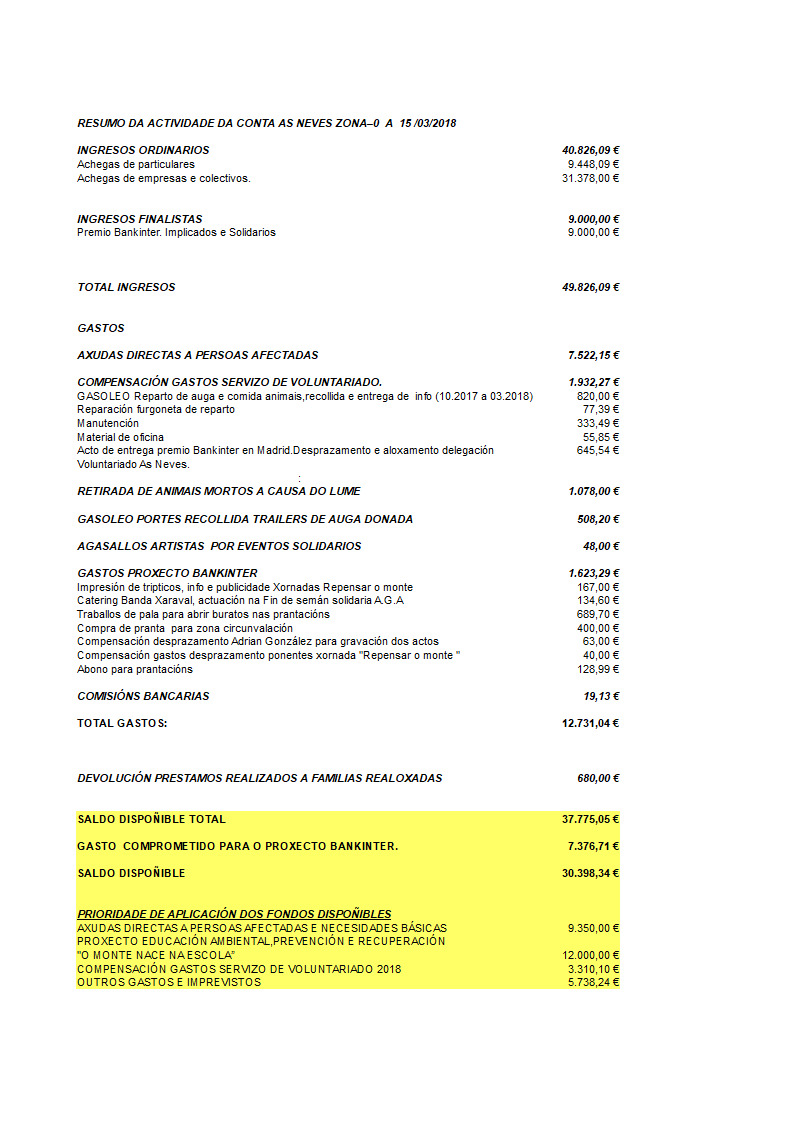 Cando se cumpren 6 meses dos lumes sufridos nas Neves no pasado mes de outubro, e segundo o anunciado, cumprimos co compromiso de informar da Conta As Neves -Zona Cero, destinada a recoller achegas de particulares e empresas para contribuir a enfrontar os danos causados polos lumes.