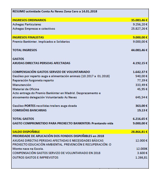 Conforme ao anunciado, e co fin de corresponder con transparencia ao esforzo solidario co pobo das Neves, cumprimos o compromiso de informar da actividade da Conta As Neves Zona Cero, destinada a recoller achegas de particulares e empresas para contribuír a enfrontar aos danos causados polos incendios de outubro de 2017.