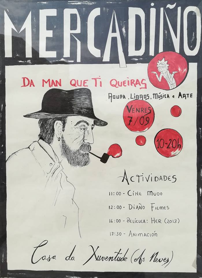 O próximo 7 de setembro arrancamos o primeiro “Mercadiño” da vila das Neves. O Mercadiño é moda, segunda man, música, arte,cine e tamén un bo lugar no que tomar algo acompñado do mellor ambiente. Calquera persoa que queira por á venta todo aquelo que non necesita que se poña en contacto con nós, así como calquera artista. Cos días iremos publicando a listaxe de actividades, estade atentas.