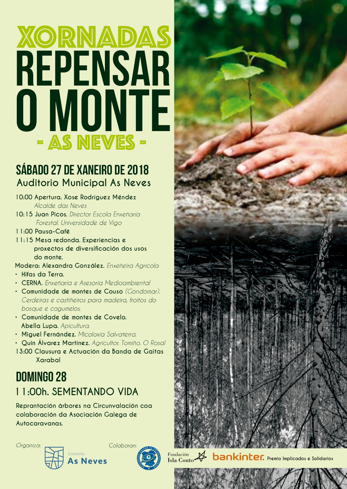 Distintas alternativas de usos produtivos para o monte serán presentadas no Auditorio das Neves o vindeiro sábado 27 de Xaneiro. O Concello organiza estas xornadas como unha nova iniciativa para para dar resposta aos danos causados polo lume do pasado 15 de outubro. Baixo o lema Repensar o Monte, distintos expertos expoñerán as súas experiencias en apicultura, micoloxía, froitos do bosque, cerdeiras e castiñeiros para madeira, entre outras. O evento abrirase ás 10 da mañá coa intervención do Alcalde das Neves, Xosé Rodríguez, e unha conferencia de Juan Picos, director da Escola de Enxeñaría Forestal da Universidade de Vigo.